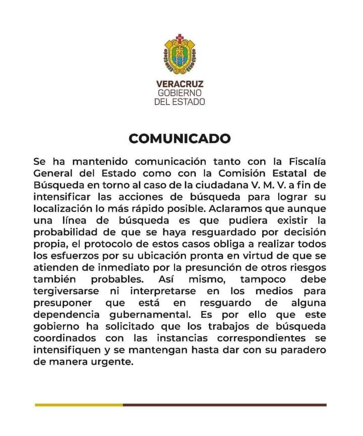 Debido a la presión de la familia por el paradero de la mujer de 31 años tras las declaraciones del Cuitláhuac García, el Gobierno de Veracruz señaló, a través de un comunicado, que “tampoco debe tergiversarse, ni interpretarse en los medios para presuponer que está en el resguardo de alguna dependencia gubernamental”.