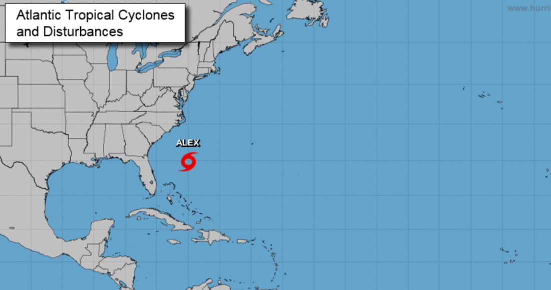 Los meteorólogos del Centro Nacional de Huracanes dijeron a las 8 de la mañana (12:00 GMT) que "Alex" tenía vientos sostenidos máximos de 80 kph (50 mph) y su centro se encontraba unos mil 020 kilómetros (635 millas) al oeste-suroeste de Bermuda.