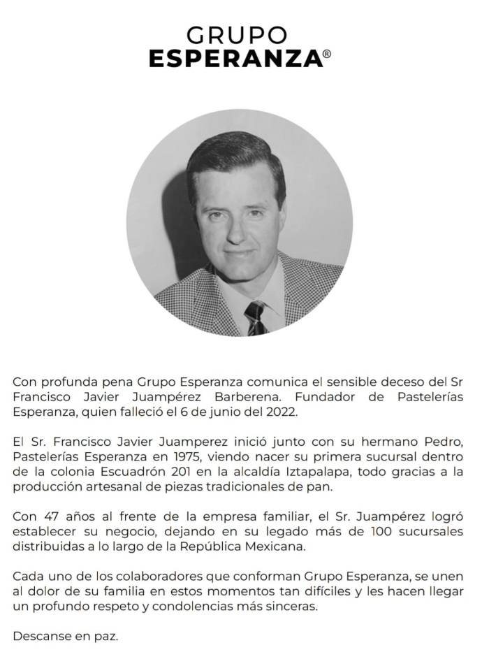 La empresa recordó que Javier Juampérez fundó la pastelería junto con su hermano Pedro Juampérez Barberena, en 1975. El deceso del empresario habría ocurrido el pasado 6 de junio, según Grupo Esperanza.