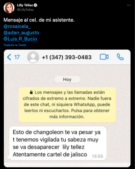 En su cuenta de Twitter, la legisladora del Partido Acción Nacional (PAN) escribió "Mensaje al cel de mi asistente", junto con una captura de pantalla donde se lee un mensaje en la plataforma de WhatsApp: "Esto de changoleon te va pesar ya t tenemos vigilada tu sabeza muy se va desaparecer lily tellez Atentamente cartel de jalisco (sic)”.
