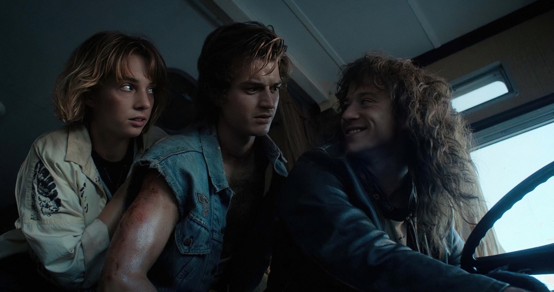 Otra imagen muestra a Eddie (Joe Quinn) leyendo un libro y rodeado por sus amigos. Max (Sadie Sink) y Lucas (Caleb McLaughlin) aparece en una foto en una habitación con luces azules, mientras que otra instantánea está protagonizada por Eddie, Robin (Maya Hawke) y Steve (Joe Keery) a bordo de un vehículo.