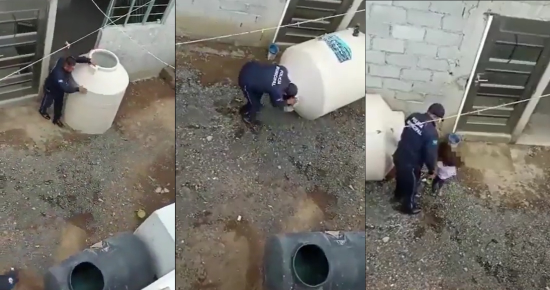 Dos oficiales lograron entrar al área donde se ubicaba el depósito de agua, y confirmaron que la niña estaba dentro, por lo que acostaron el tinaco, que tenía un poco de agua, para poder sacarla.