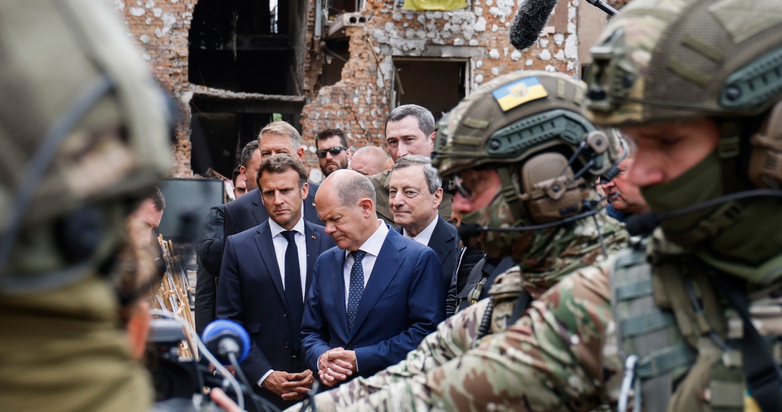 El Presidente de Francia, Emmanuel Macron (izquierda); el Primer Ministro de Italia, Mario Draghi (centro, derecha) y el Canciller alemán, Olaf Scholz (centro), durante una visita a Irpín, Ucrania, el 16 de junio de 2022. Foto: Ludovic Marin, Pool vía AP.