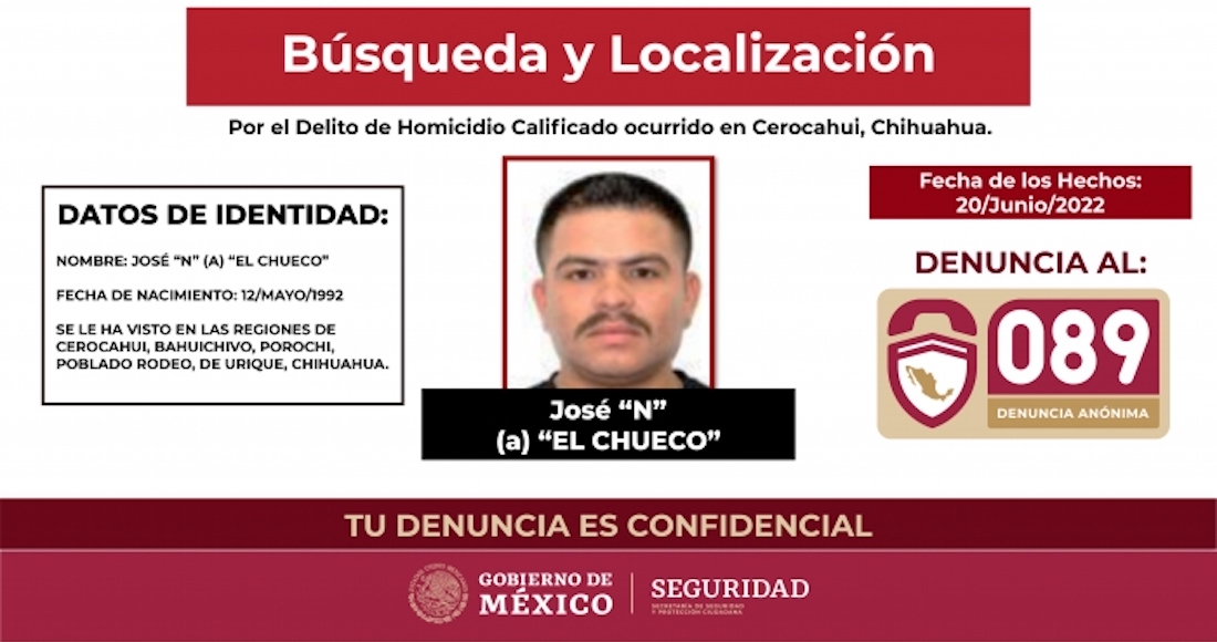 Con base en la legislación y al haber una solicitud de colaboración, la Secretaría de Seguridad y Protección Ciudadana (SSPC) emitió ayer una boleta de búsqueda y localización en contra de José "N", alias "El Chueco", presunto homicida de los dos sacerdotes y el guía de turista.