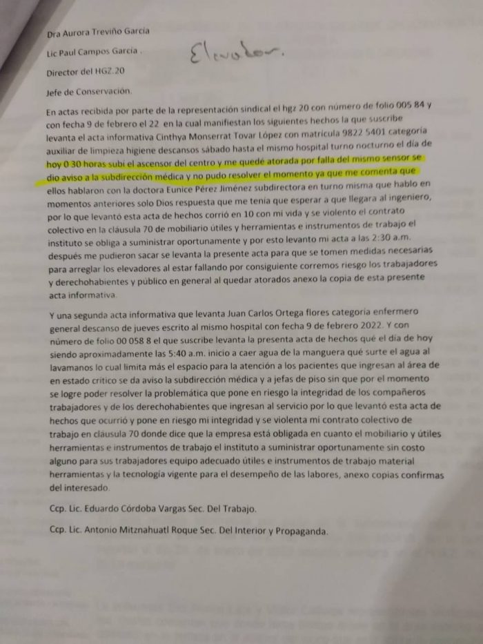 “Esta situación ha sido reportada desde hace años, incluso ha presentado riesgo hacia los trabajadores ya que se han averiado con el personal dentro. Aunado a que se encuentran desnivelados, cabe mencionar que este tipo de elevadores ya no son adecuados para un hospital ya que no son de uso intensivo hospitalario por las dimensiones”.
