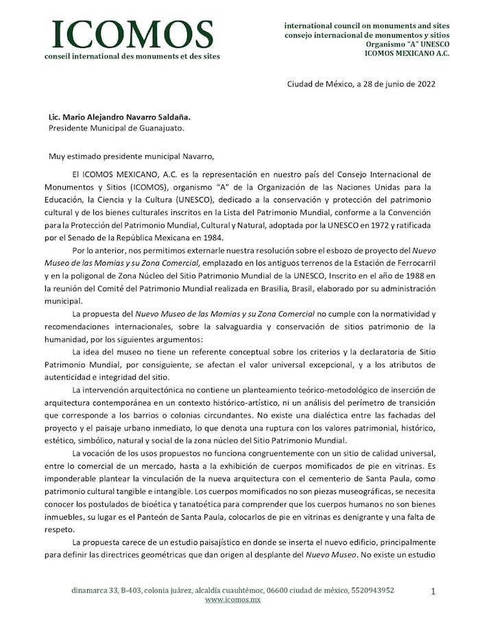 El Consejo Internacional de Monumentos y Sitios (Icomos) en México emitió una carta en la que expresó su rechazo al proyecto del nuevo museo de Las Momias y su zona comercial, que impulsa el Presidente municipal de Guanajuato, Alejandro Navarro Saldaña, con el que busca reubicar los famosos cuerpos momificados a salas de exhibición que formarían parte de un conjunto de locales comerciales, lo que para el organismo internacional sería motivo para que Guanajuato pierda su clasificación como Ciudad Patrimonio de la Humanidad.