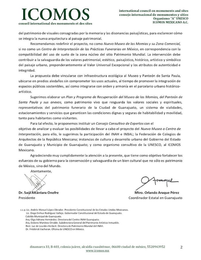 A través de una carta dirigida al Presidente Municipal de Guanajuato, Alejandro Navarro Saldaña, principal impulsor de este proyecto, el presidente de Icomos, Saúl Alcántara Onofre, y el Coordinador estatal en Guanajuato, Orlando Araque Pérez, enfatizaron que la obra también es “denigrante y una falta de respeto” para los cuerpos momificados que pretenden exhibir, ya que éstos no son piezas museográficas que puedan dejar de pie para exponerlas, por ello, subrayó, su lugar es el Panteón de Santa Paula.