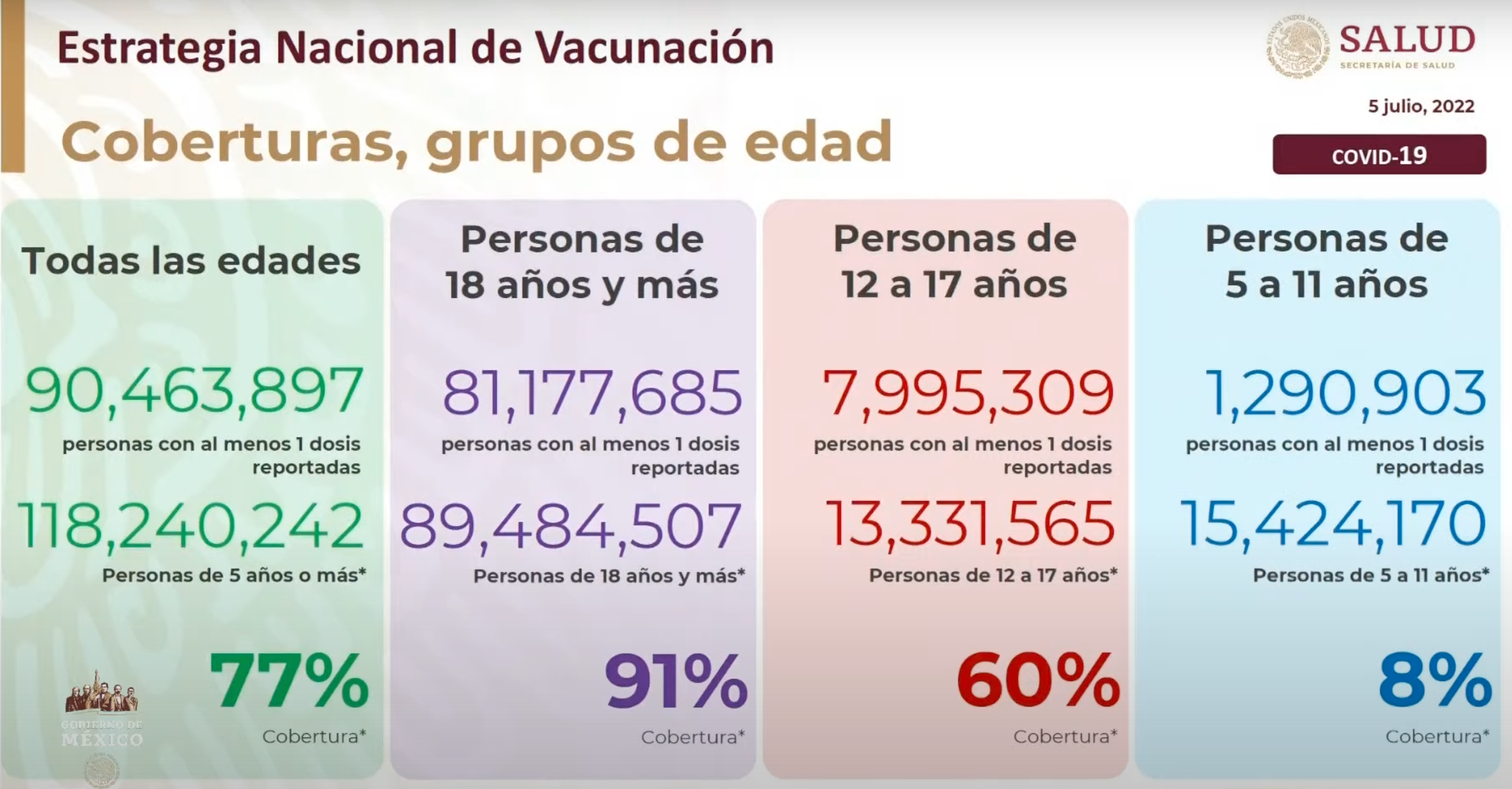 De acuerdo con los datos presentados por el Subsecretario de Salud, 90 millones 463 mil 897 cuentan ya con al menos una dosis anticovid, lo que representa una cobertura del 77 por ciento. Del grupo de edad de mayores de 18 años, 81 millones 177 mil 685 han acudido al centro de vacunación para recibir al menos una dosis, es decir, el 91 por ciento; los menos de edad de 12 a 17 años alcanzan casi los ocho millones, que equivale al 60 por ciento; mientras que el último grupo, de cinco a 11 años, lleva un millón 290 mil 903 dosis, cubriendo el ocho por ciento del total.