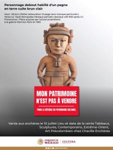 “La Secretaría de Cultura del Gobierno de México y el Instituto Nacional de Antropología e Historia (INAH) condenan enérgicamente la subasta anunciada por la casa francesa AutionFR, titulada Tableaux, Sculptures, Contemporains, Extrême-Orient, Art Précolombien chez Chaville Enchères”, señalaron.