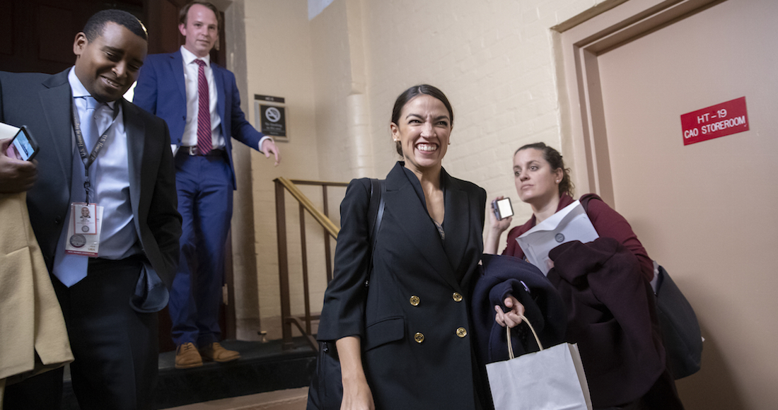 Ocasio-Cortez comenzó a dirigirse hacia él, pero una asistente le antepone un brazo para instarla a retroceder.