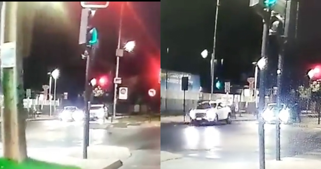 Una cámara de seguridad grabó como el par de sospechosos descendió de un automóvil Seat blanco para tratar de interceptar y amagar a su víctima.