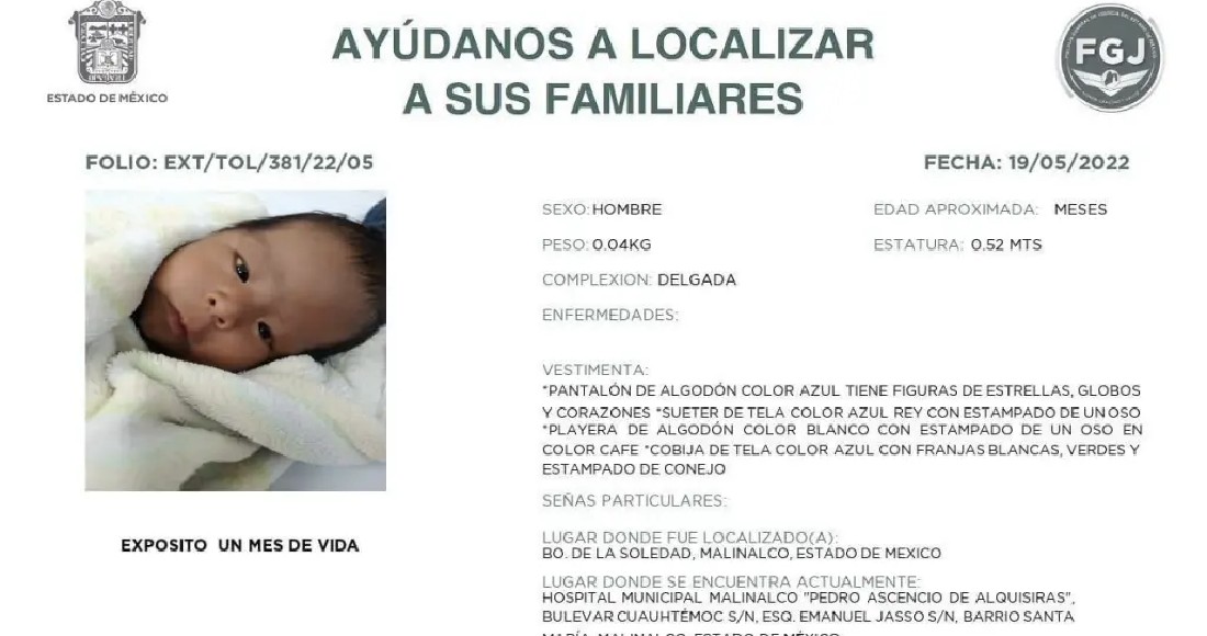 El bebé fue trasladado a un hospital para su atención médica especializada, mientras que las autoridades ministeriales correspondientes realizarán los trámites para el cuidado del bebé, así como la identificación y búsqueda de sus familiares.