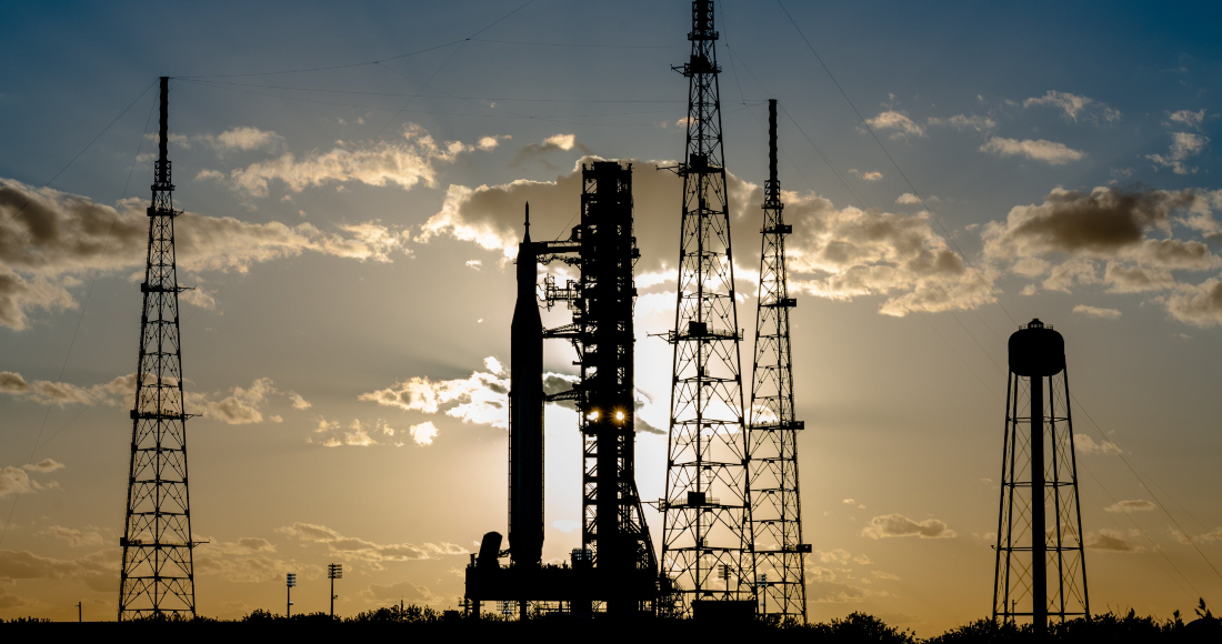 El cohete del Sistema de Lanzamiento Espacial, de 30 pisos de altura, y la capsula Orion adjunta se encuentran actualmente en el hangar del Centro Espacial Kennedy luego de reparaciones derivadas del conteo regresivo de prueba del mes pasado. Durante los repetidos ensayos de lanzamiento desde la plataforma surgieron fugas de combustible y otros problemas técnicos.
