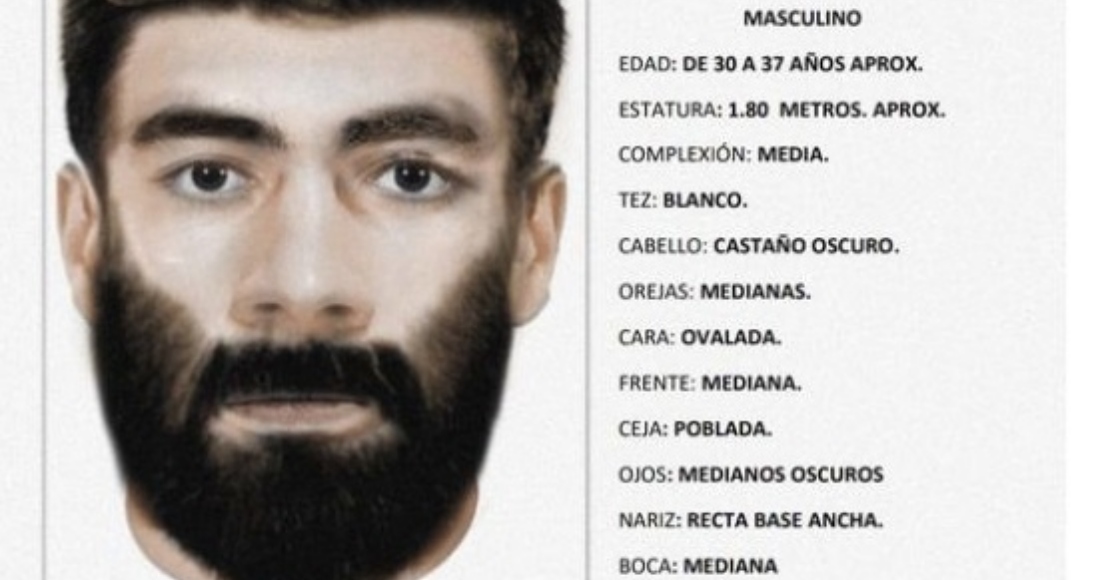 Asimismo, el departamento de fotografía forense reveló el retrato hablado donde se observa a una persona de entre 30 y 37 años, 1.80 metros de estatura aproximada, tez blanca, cabello oscuro, orejas medianas, cara ovalada, cejas pobladas, ojos oscuros, nariz recta ancha, boca mediana, labios delgados, barba y bigote cerrados y poblados.
