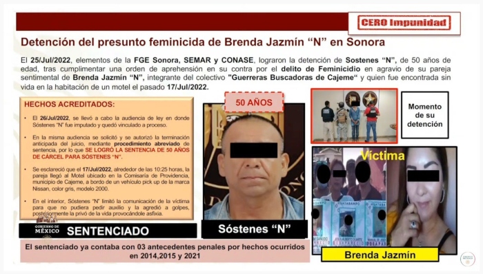 Ciudad de México, 28 de julio (SinEmbargo).- Ricardo Mejía Berdeja, Subsecretario de Seguridad Pública de la Secretaría de Seguridad y Protección Ciudadana (SSPC), confirmó esta mañana que Sóstenes “N” fue sentenciado a 50 años de prisión por el feminicidio de Brenda Jazmín en Sonora.