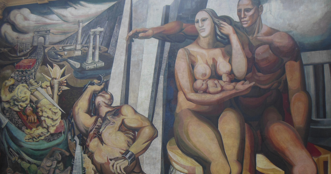 En los 232 metros cuadrados de obra en San Salvador, junto a revolucionarios, héroes patrios y figuras prehispánicas proliferan personajes femeninos, mujeres que votan, que enseñan, que amamantan.