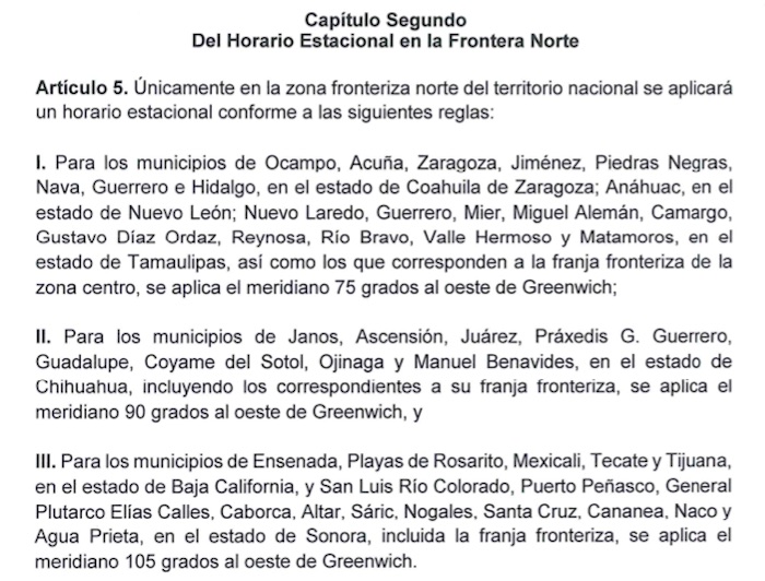 "La presente iniciativa propone abrogar la Ley vigente (2001) para sustituirla por una nueva que reconoce los husos horarios conforme al meridiano de Greenwich pactado internacionalmente en 1884. No obstante, se plantea mantener un horario estacional de excepción para los municipios de la frontera norte (13 millones de habitantes) dada la profunda integración laboral, social, cultural y económica existente con la zona fronteriza colindante de los Estados Unidos", expone.