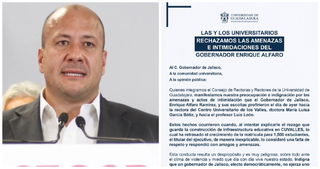 “Quienes integramos el Consejo de Rectoras y Rectores de la Universidad de Guadalajara manifestamos nuestra preocupación e indignación por las amenazas y actos de intimidación que el Gobernador de Jalisco, Enrique Alfaro Ramírez, y sus escoltas profirieron el día de ayer hacia la Rectora del Centro Universitario Valles y hacia el profesor Luis León”, manifestó la universidad.