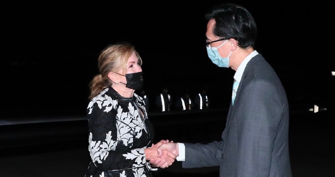 La presidenta de la Cámara de Representantes de EU, Nancy Pelosi, habla con el Ministro de Exteriores, Joseph Wu, al llegar a Taipéi, el pasado 2 de agosto de 2022. Foto: Ministerio de Relaciones Exteriores de Taiwán vía AP
