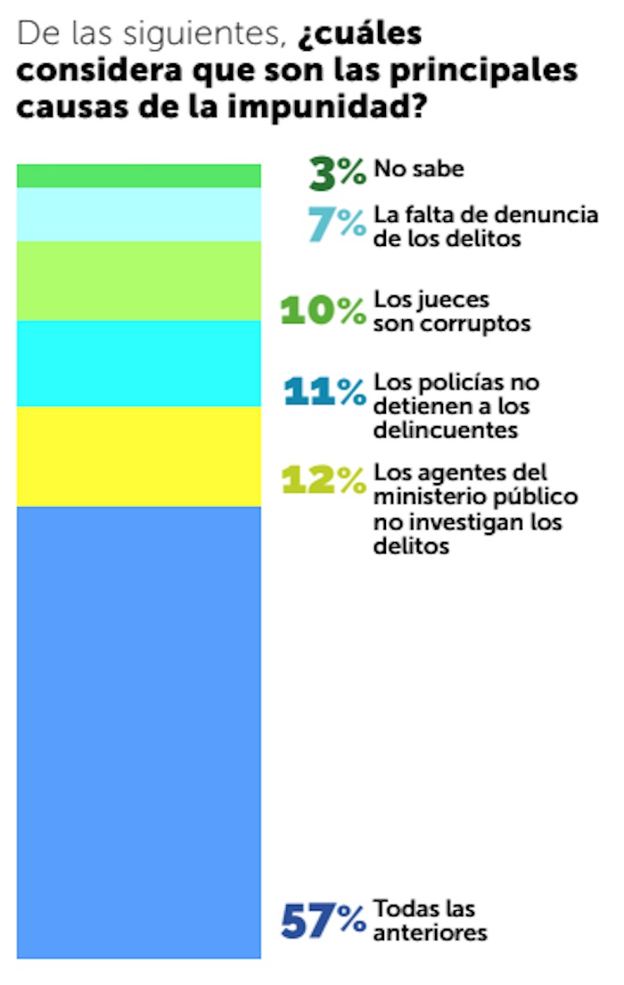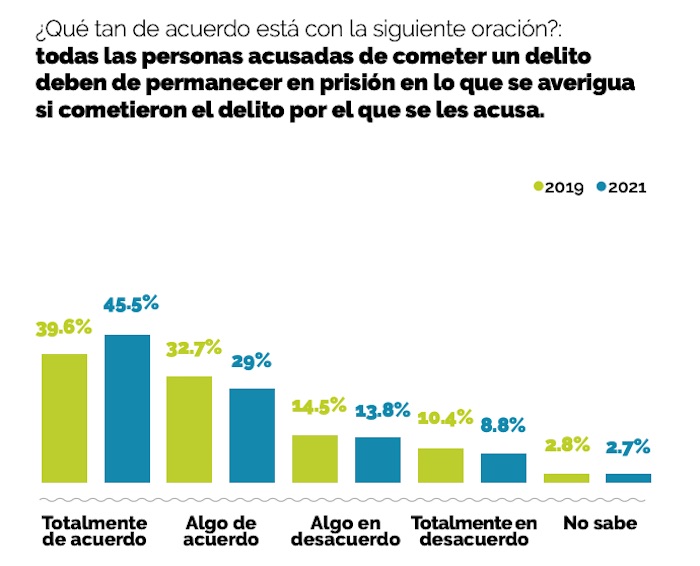 Entre la ciudadanía, pese a existir otras medidas cautelares como localizador electrónico o prohibir acercarse a la víctima, el 74.5 por ciento está "totalmente" o "algo de acuerdo" con que todas las personas acusadas de cometer un delito deben de permanecer en prisión en lo que se averigua si cometieron el delito por el que se les acusa, de acuerdo con la encuesta de Impunidad Cero aplicada a finales del año pasado. Y el 10 por ciento de los encuestados considera que la principal causa de la impunidad son los "jueces corruptos".