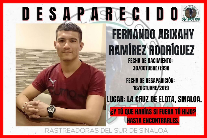 En el video de un minuto, grabado por el proyecto #HastaEncontrarles, se le ve con la foto de su hijo Fernando Abixahy Ramírez Rodríguez, y se le escucha decir: “No sé de su paradero. Lo he buscado de día y de noche y nada más nada. Lo único que sé es que se lo llevaron unos hombres armados en un carro blanco”. Y denuncia la inacción de las instituciones: “Yo espero una respuesta, yo busco a mi hijo, no busco responsables”.