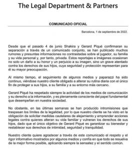 "Desde el pasado 4 de junio se han publicado muchos rumores y presuntas informaciones no contrastadas sobre el jugador, su familia y su vida personal y, por tanto, privada" comienza el texto que el bufete The Legal Department y Partners remitió a diferentes medios de comunicación, que continúa 'denunciando' que "estos reportajes e imágenes ocasionan no sólo un daño a su honor y un perjuicio" a la imagen de Gerard, sino también "un grave atentado contra los derechos de sus hijos, cuya seguridad y protección representan para él su mayor preocupación".
