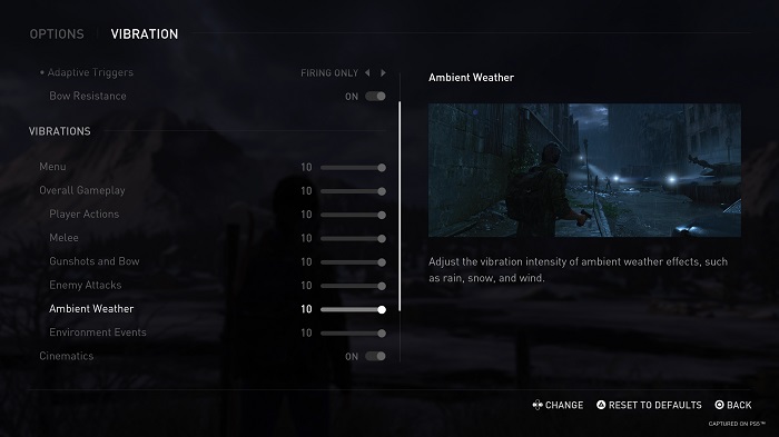 También los controles han sufrido ligeros cambios para aprovechar las cualidades del control del PlayStation 5, Dual Sense, donde no sólo se incluyeron la características de los gatillos adaptativos para el control que reaccionan al momento de disparar, tensar el arco o crear gasas y demás objetos, sino que también incluye una opción de personalización de nivel vibración para el clima del juego (como lluvia), los disparos, golpes, acciones del jugador, entre otras cosas. Además de poner opciones de controles alternativos para facilitar ciertos comandos, cambiarlos o modificarlos por completo.