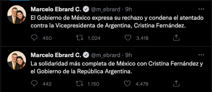"El Gobierno de México expresa su rechazo y condena el atentado contra la Vicepresidenta de Argentina, Cristina Fernández", escribió en su cuenta personal de Twitter.