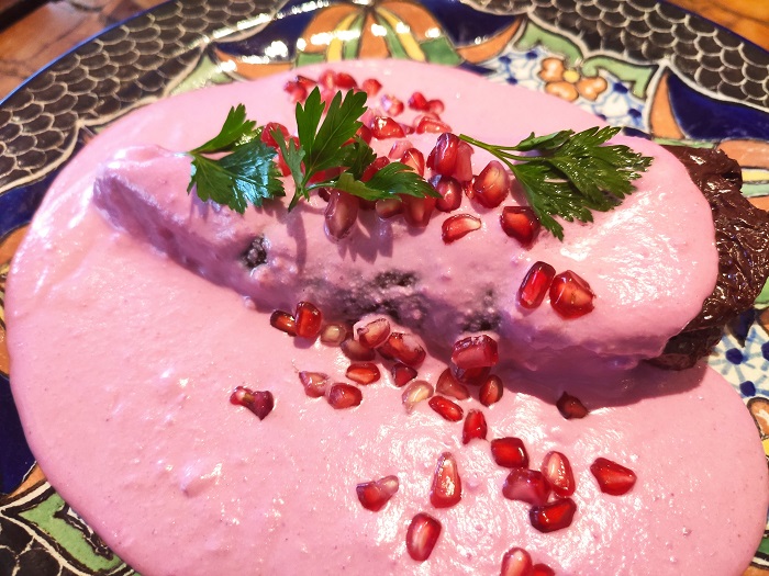 El relleno del chile es elaborado con 400 gramos de filete preparado con frutos, nueces y granada, bañado en su cremosa y única nogada, además se acompaña de plátanos fritos y se marida con vino rosado.
