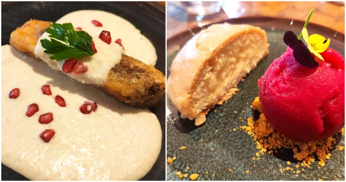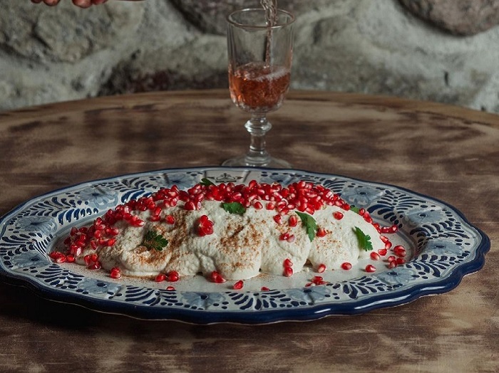 El restaurante Danzantes es un espacio que cuida, respeta y siempre está innovando pero sin olvidar la esencia que hace de la comida mexicana una de las más deliciosas debido a sus sabores, aromas y colores. Para este Festival de Chiles en nogada Los Danzantes unió esfuerzos con el restaurante Mura de los poblanos, peto el platillo que sin duda cautiva es el chile en nogada rosa, este es un clásico que crea polémica pero que enamora y se prepara con chile ancho con un relleno tradicional de dos carnes (cerdo de pastoreo y res de Sonora), se baña con la nogada rosa que se cocina con buganvilias y moras, una delicia imperdible.