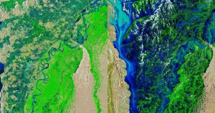 Las imágenes en “falso color” difundidas por la NASA adquiridas por Operational Land Imagers instalado en los satélites Landsat 8 y Landsat 9, combinan luz infrarroja de onda corta, infrarroja cercana y roja para distinguir mejor las aguas de inundación (azul profundo) más allá de sus canales naturales.