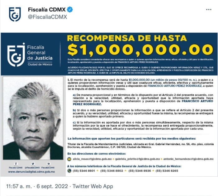 Por medio de sus redes sociales, la Fiscalía capitalina comentó que la recompensa se otorgará a quienes presenten información "veráz y útil que coadyuve eficaz, eficiente y efectivamente" para lograr la localización y captura del señalado por homicidio doloso.
