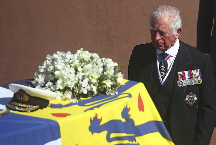 El príncipe Carlos sigue el ataúd de su padre, el príncipe Felipe, durante el funeral en el castillo de Windsor, Inglaterra. Foto: Hannah McKay, vía AP.