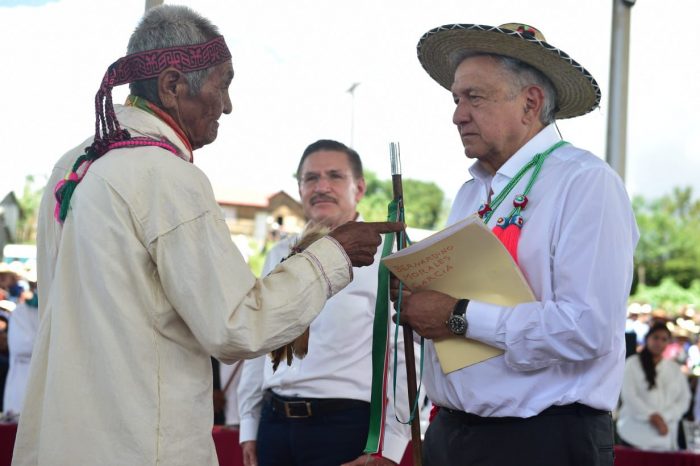 El Presidente López Obrador visitó el pueblo O'dam en Mezquital, Durango, con el fin de firmar su Plan de Justicia. Foto: Presidencia.