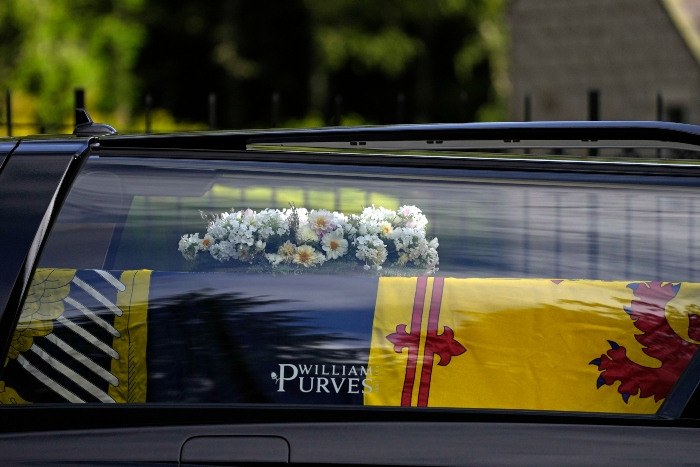 El auto pasó junto a ramos de flores y otros homenajes en un cortejo fúnebre de siete autos desde Balmoral, donde falleció la reina el jueves, para su viaje de seis horas hasta el palacio de Holyroodhouse en Edimburgo. El ataúd estaba cubierto por el estandarte real de Escocia y encima se colocó una corona de flores de la finca, incluidas las de guisantes dulces, una de las favoritas de la reina.