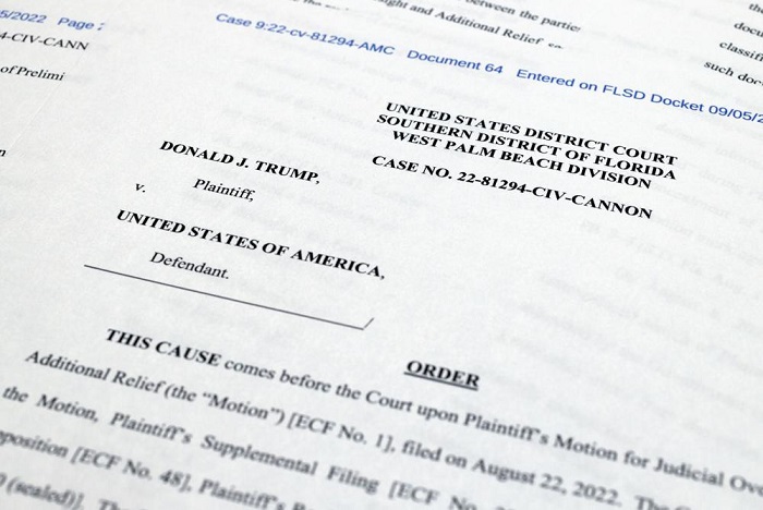 Una página de la orden que otorga una solicitud del equipo legal del expresidente Donald Trump para nombrar a un maestro especial para revisar los documentos incautados por el FBI durante una búsqueda en su propiedad de Mar-a-Lago. Foto: Jon Elswick, AP