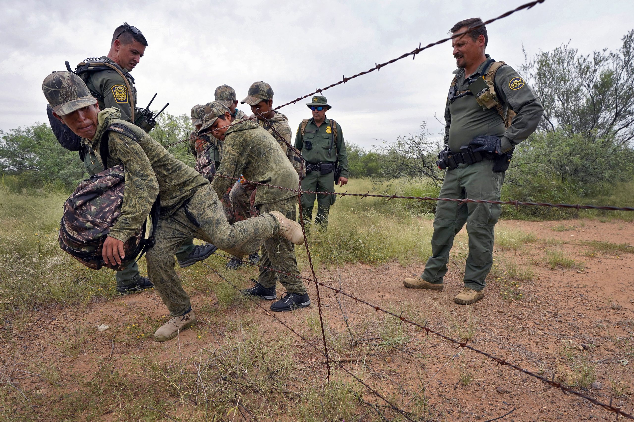 Migrantes detenidos por la Patrulla Fronteriza atraviesan un cerco de alambres de púas cerca de Sasabe (Arizona) el 8 de septiembre del 2022. Foto: Matt York, AP.