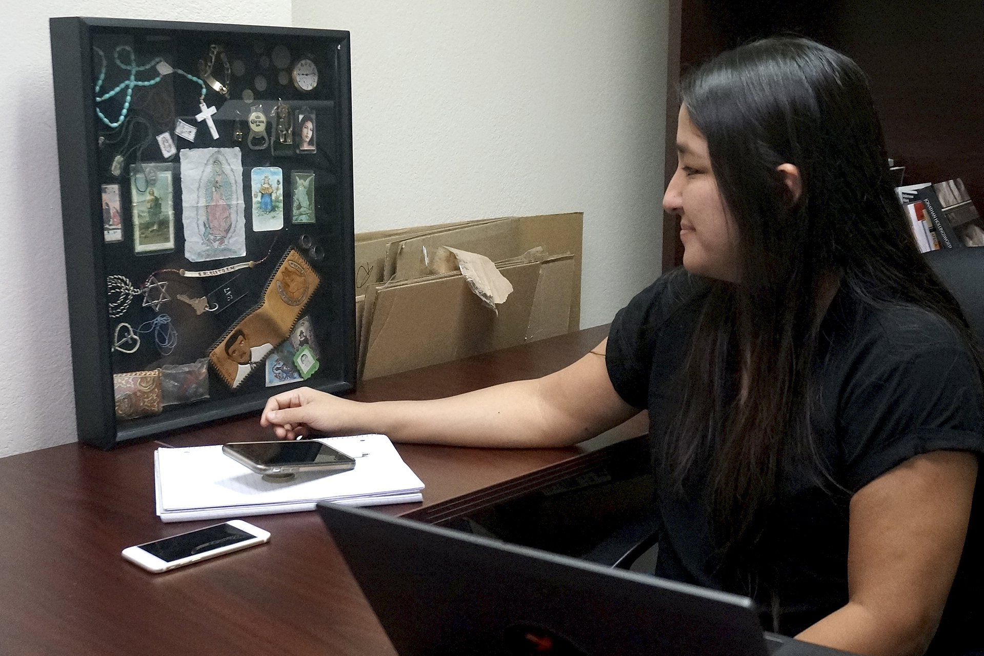 Mirza Monterroso, forense y directora del Centro Colibrí, que ayuda a ubicar e identificar a migrantes desaparecidos en la frontera entre México y EU, examina objetos encontrados entre los restos de un migrante fallecido en el desierto. Foto: Giovanna Dell'Orto, AP.