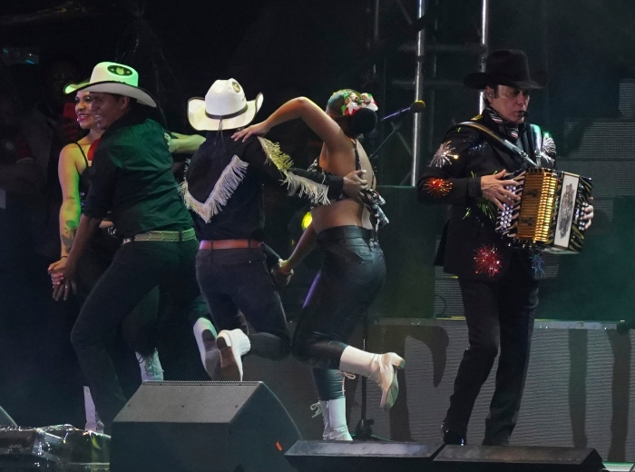 Jorge Hernández de la banda norteña Los Tigres del Norte toca su acordeón durante su concierto del Grito de Independencia en el Zócalo de la Ciudad de México el jueves 15 de septiembre de 2022. Foto: Fernando Llano, AP.