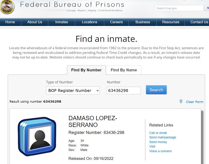 Mazatlán, 17 de septiembre (Noroeste).- El capo sinaloense Dámaso López Serrano, alias “El Mini Lic”, quien es señalado como presunto autor intelectual del homicidio del periodista Javier Valdez Cárdenas, asesinado el 15 de mayo de 2017 en Culiacán, fue liberado este viernes 16 de septiembre, según el número oficial de registro 63436-298, del Buró de Prisiones (BOP, por sus siglas en inglés).