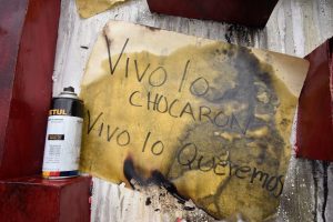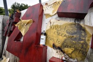 En los videos se observa como dos hombres, uno de ellos vestido de pantalón de mezclilla y zapatos rojos, con el torso descubierto, y el segundo vestido de bermuda negra y playera verde, prenden fuego al antimonumento y luego se retiran del lugar.