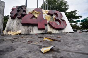 Acapulco, 18 de septiembre (ElSur).- Normalistas de Ayotzinapa llegaron al monumento a Las Banderas, en Chilpancingo, Guerrero, para limpiar el antimonumento a los 43 jóvenes desaparecidos que la madrugada de este domingo fue vandalizado por dos hombres.