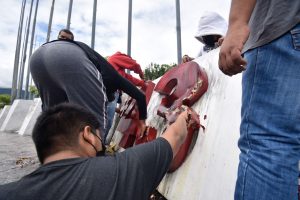 Cerca de mediodía los jóvenes llegaron al lugar en una camioneta de la Normal Rural Raúl Isidro Burgos, y comenzaron a limpiar con espátulas, thinner y brochas los daños a la estructura metálica.