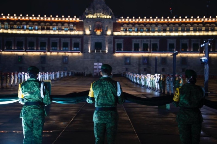 Elementos de la Sedena transportan la Bandera de México para su izamiento a media asta. Foto: Gobierno de México.