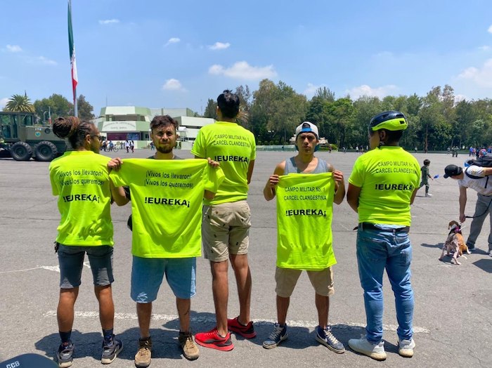 Los jóvenes portaban camisetas de color verde fluorecente, que tenían impresas las frases de lucha de la organización y que también corearon: “Vivos los llevaron! ¡Vivos los queremos! ¡”Eureka!”.