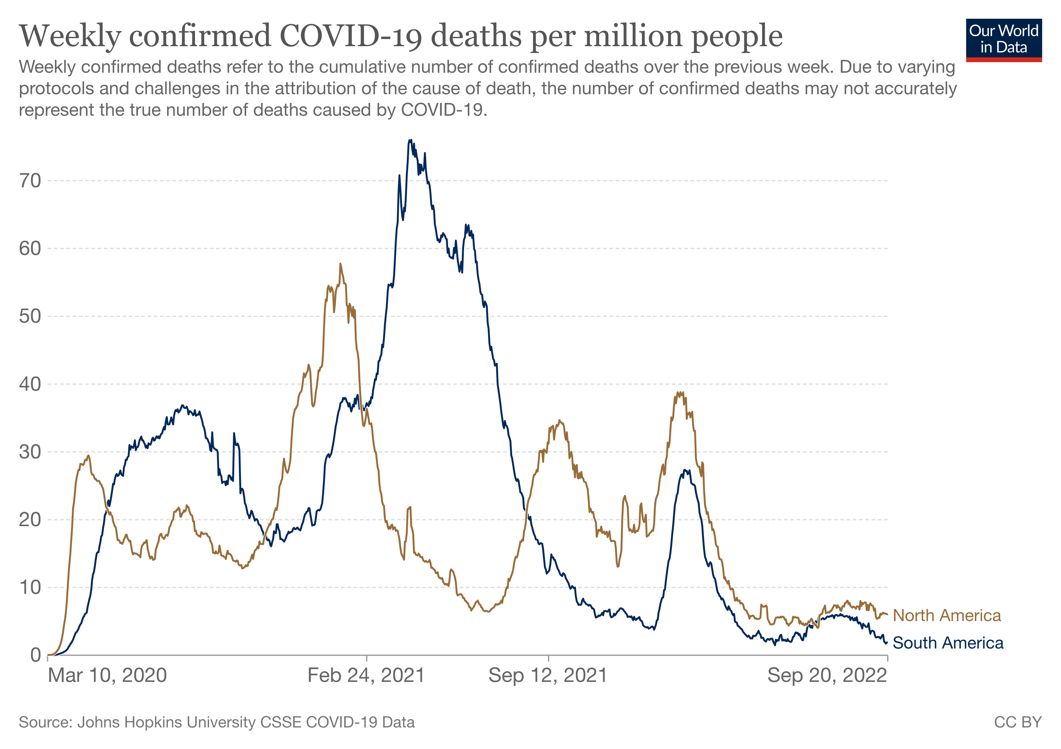 La primera semana de septiembre, los casos cayeron un 12.9 por ciento y las muertes un 10.1 por ciento con respecto a la semana anterior. La quinta, cuarta, tercera y segunda semanas de agosto también registraron consistentes caídas semanales.