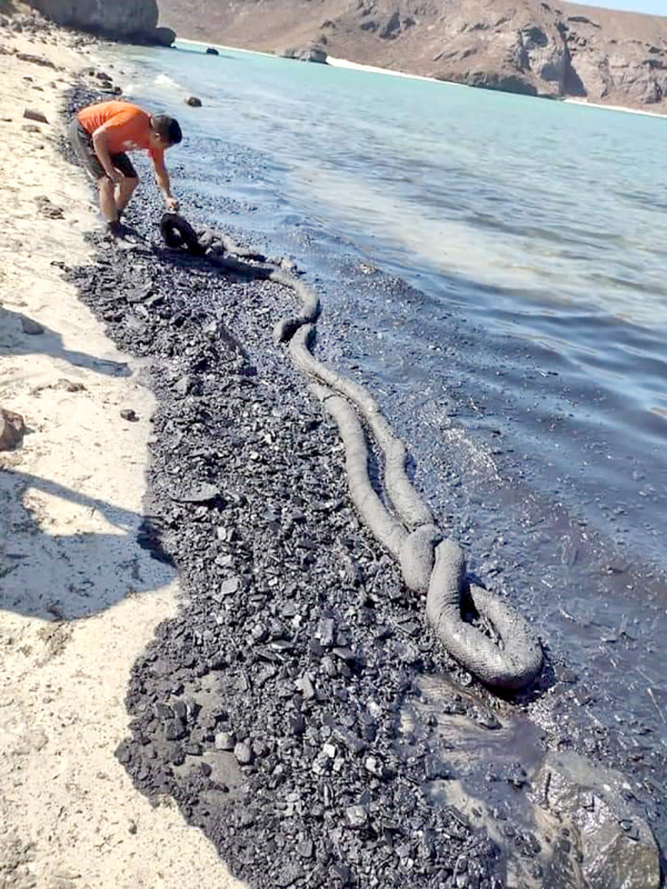 “Suerte efectivamente, realmente fue lo mejor que pudo haber pasado con este hundimiento. Toda la materia que se quemó y que flotaba, se acumuló en la playa del hongo y las corrientes y el viento lo mantuvo solamente en esa playa de 300 metros, y se acumuló de la mitad hacia la parte del estacionamiento, lo que hicieron fue contener esa parte. Se notaba iridiscencia en el agua y en las rocas cercanas al hongo, fue la playa más afectada y eso era lo evidente, lo que estaba flotando: el hollín, el carbón. En otras playas de la Bahía de Balandra, Tecolote Sur, Tecolote Norte, se vieron algunas piezas de carbón, pero sin rastros de combustible”, informó Alberto Guillén.