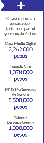 Otra de las empresas involucradas Mass Media Digital que pertenece a Grupo IV y cuyo director es Christian Silva Olea, facturó para el gobierno de Padrés dos millones 262 mil pesos durante 2011, mientras que la firma Impacto Vinil, también del grupo, un millón 078 mil pesos. Ambas por operar decenas de carteleras propagandísticas.