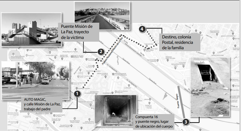 A las 16:51 horas del martes 6 se reportó ante las autoridades la localización de dos cuerpos en estado de descomposición tras la compuerta 16 -que estaba cerrada- de la canalización Río Tijuana, alrededor de 100 metros hacia el Sur del Puente Negro, pegado a la Vía Rápida Poniente que circula de norte a sur de la ciudad.