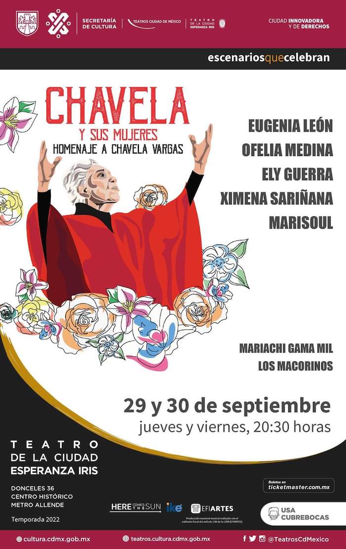 "Chavela y sus Mujeres, Un Homenaje a Chavela Vargas" tendrá dos únicas funciones los días jueves 29 y viernes 30 de septiembre, Eugenia León, Ofelia Medina, Ely Guerra, Ximena Sariñana y Marisoul serán acompañadas por el Mariachi Gama Mil y Los Macorinos para rendir tributo a "La Chamana".